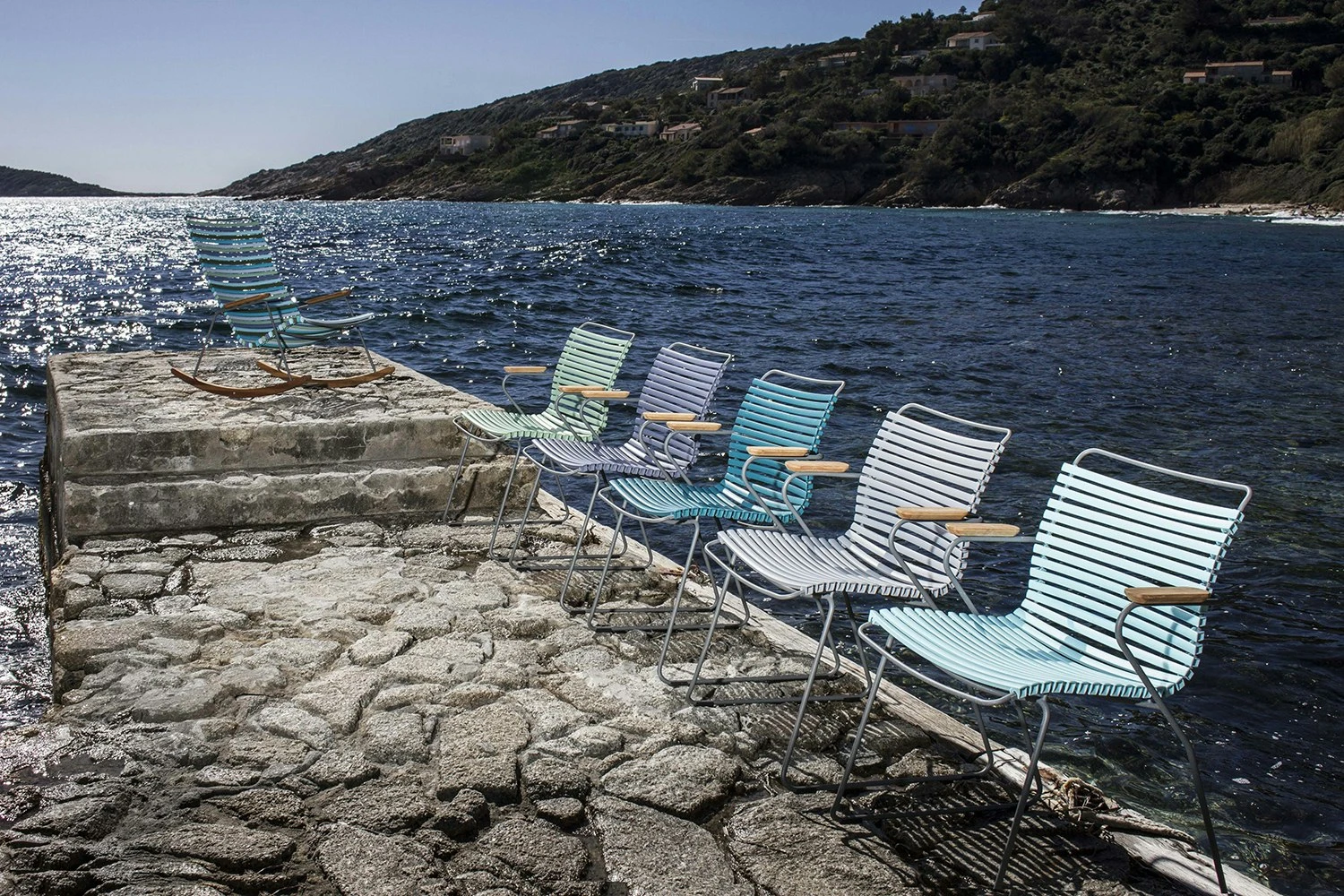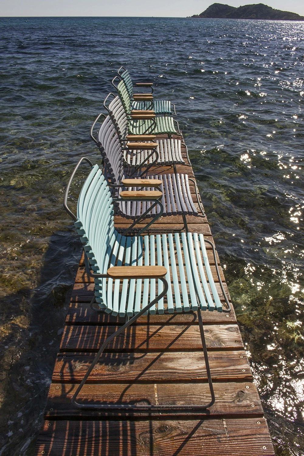 This outdoor dining chair from Houe is part of the Click series, which is designed by Henrik Pedersen. The comfortable chair has an ergonomic design that is very well thought out. Click is made with a frame of powder-coated grey metal, a seat of plastic lamellas and two armrests in bamboo. Available in 14 different colours.